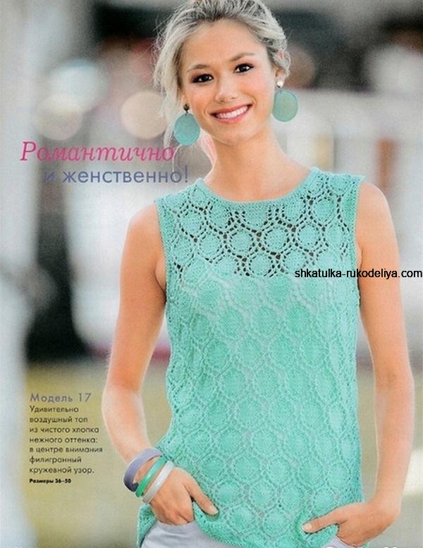 вязание спицами, топ, бирюзовый, летний, кружевной, схема, описание, женский, из хлопка