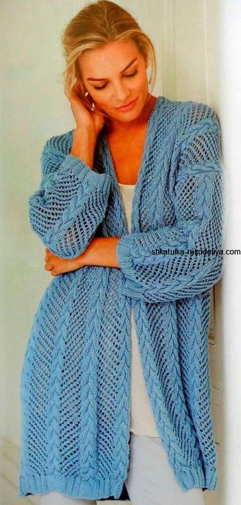 Длинный кардиган с косами спицами. Стильные вязаные кардиганы спицами схемы