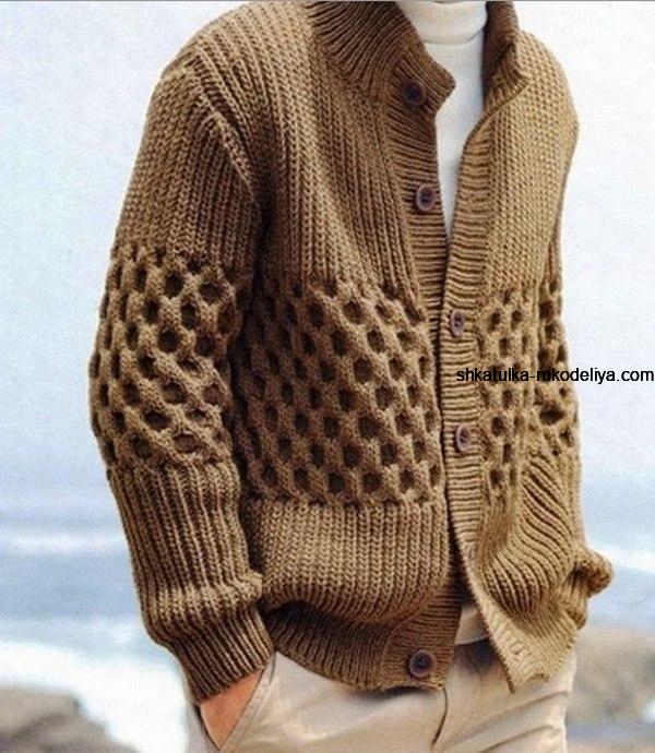 Коричневый жакет для мужчин спицами. Стильный жакет для мужчин с пуговицами