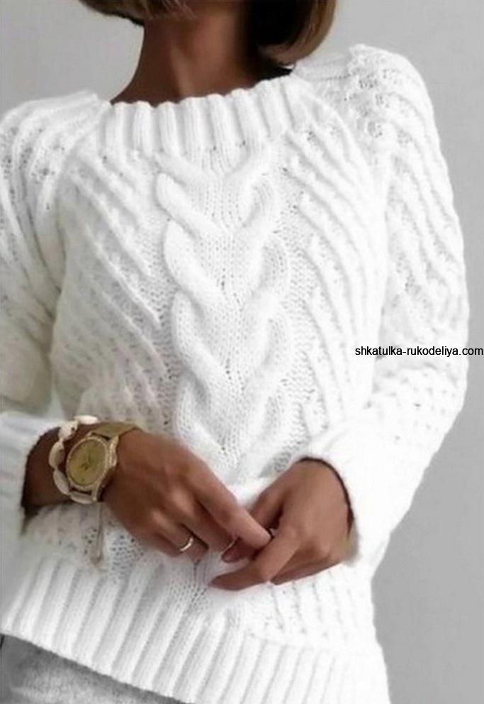 Белый джемпер спицами с центральной косой. Шерстяной джемпер узором сетка из вытянутых петель с описанием