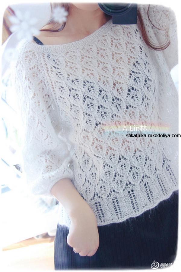 вязание спицами, пуловер, схема, тонкий мохер, японская модель, узор листья, женский, белый