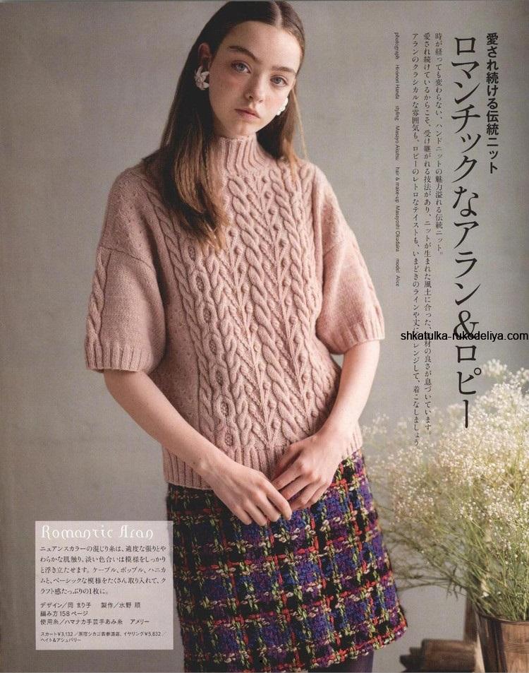 вязание спицами, пуловер, косы, короткий рукав, японская модель, женский
