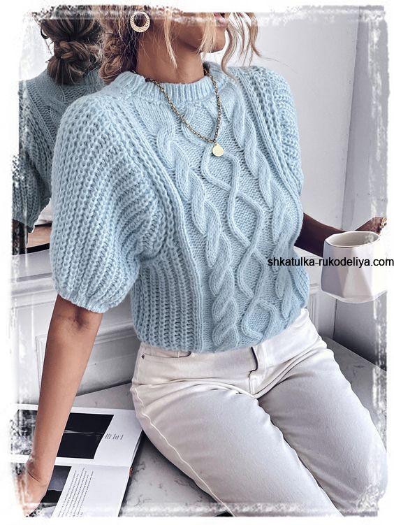 Джемпер з пишними рукавами до ліктя спицями