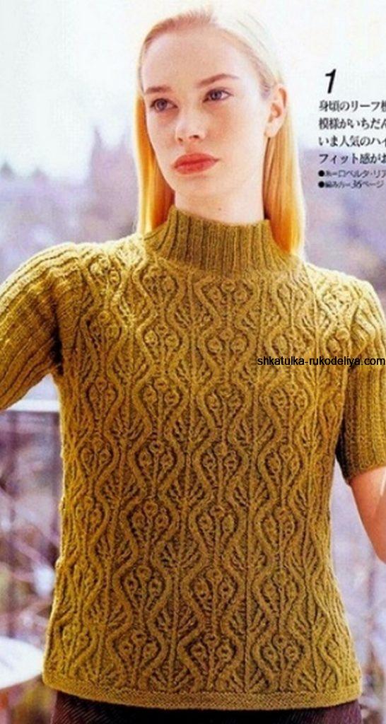 Пуловер горчичного цвета спицами. Пуловер с короткими рукавами спицами