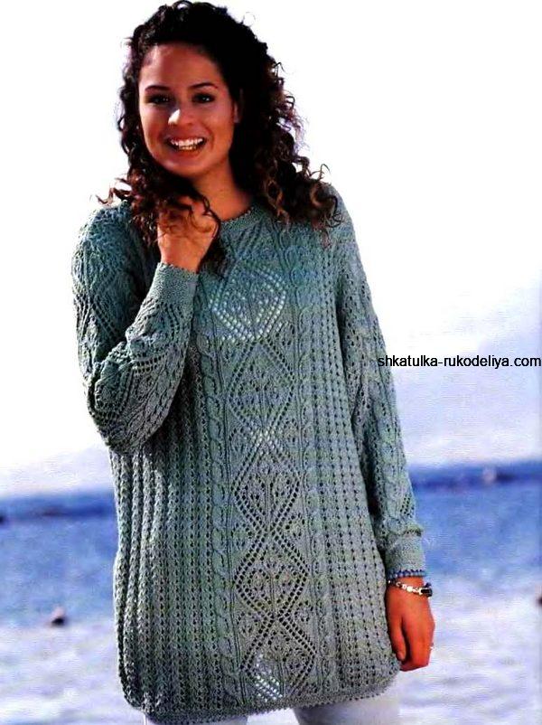 вязание спицами, пуловер, схема, описание, длинный, узор ромб, для женщин