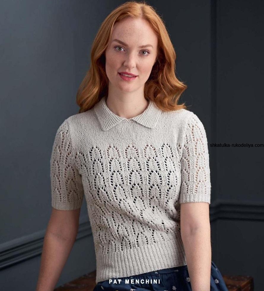 Пуловер с отложным воротником спицами. Пуловер с коротким рукавом и ажурным узором с описанием