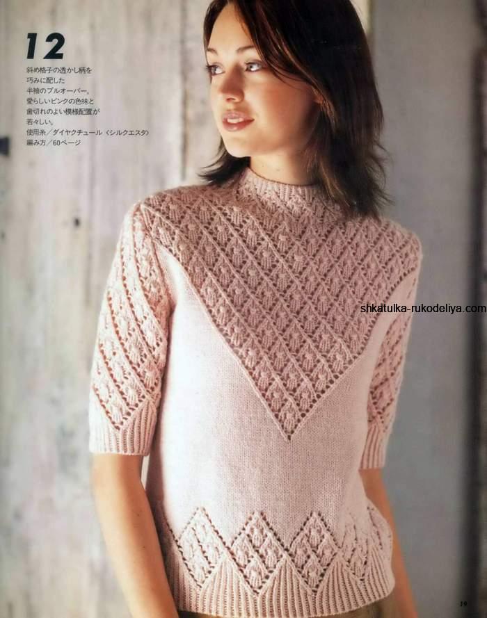 Пуловер с треугольной кокеткой спицами . Пуловер с коротким рукавом схемы