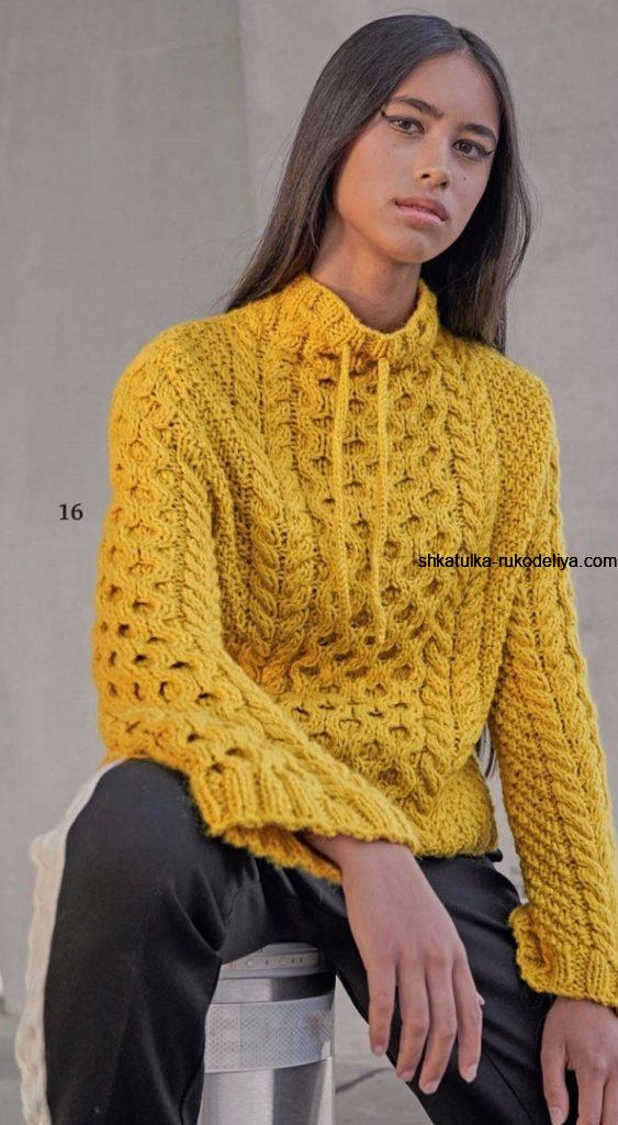 вязание спицами, пуловер, схема, описание, женский, узор коса, соты, теплый, воротник стойка