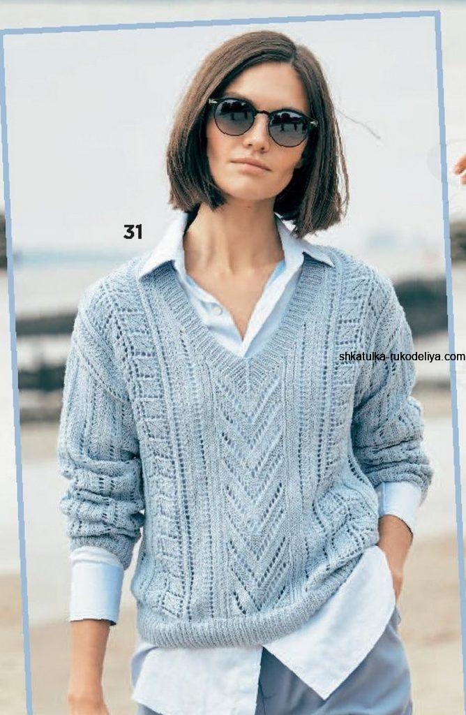 The V-neck sweater looks completely natural and surprisingly casual. This blue organic cotton model with an unusual pattern is a real highlight of knitwear!
