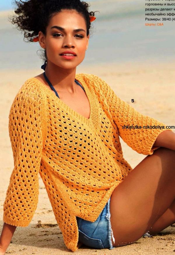 Пуловер с v-образным вырезом горловины спицами. Летняя модель пуловера сетчатым узором с описанием