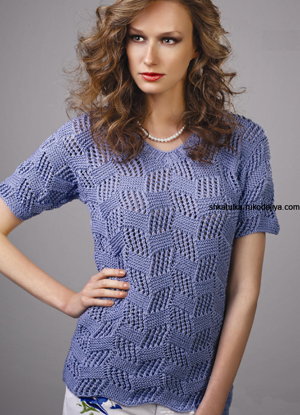 Пуловер шахматным узором спицами