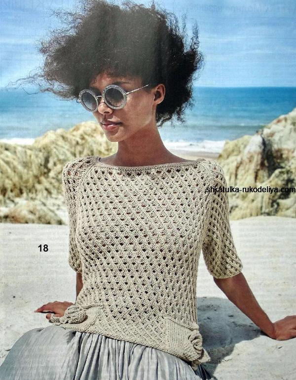 вязание спицами, пуловер, схема, описание, накладные карманы, реглан, короткий рукав, женский, сетчатый