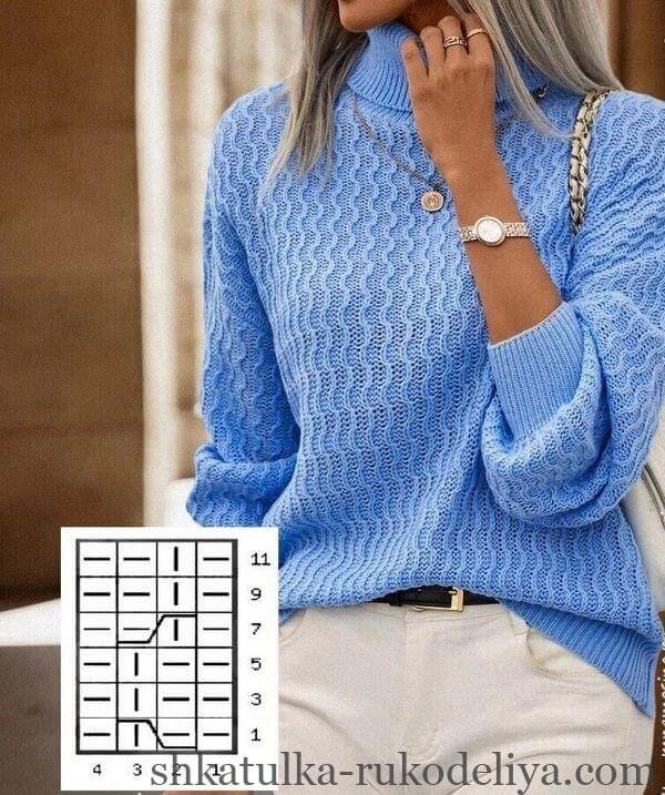 На малюнку схема візерунка. Порожні клітини-це виворітні петлі. Раппорт візерунка дуже невеликий – чотири петлі, чотири ряди