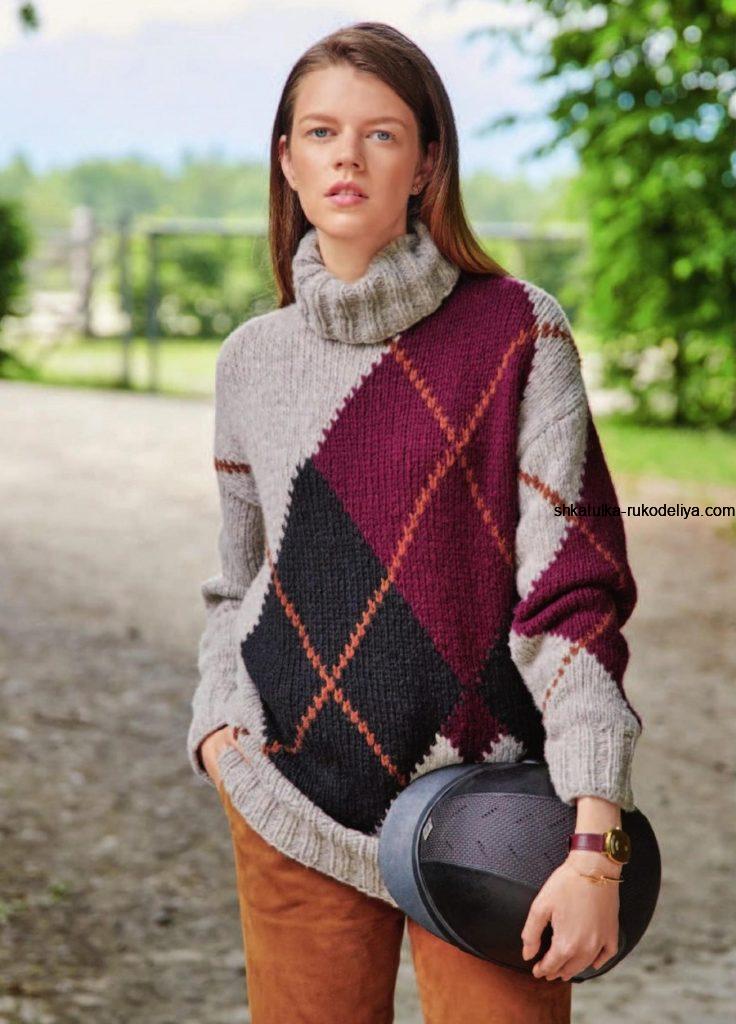 Свитер спицами с интарсией из крупных ромбов. Свитер с высоким воротником