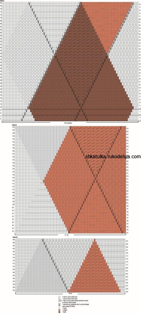 Интарсия: во время вязания цветного узора по схемам, следует после каждой смены цвета нити перекручивать нити между собой для того, чтобы в месте перехода цветов не было дырочек в полотне.