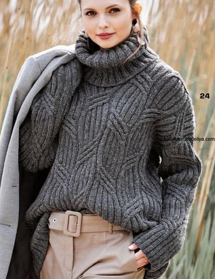 вязание спицами, пуловер, воротник гольф, серый, женский, схемы, описание, оверсайз, стильный, 2021