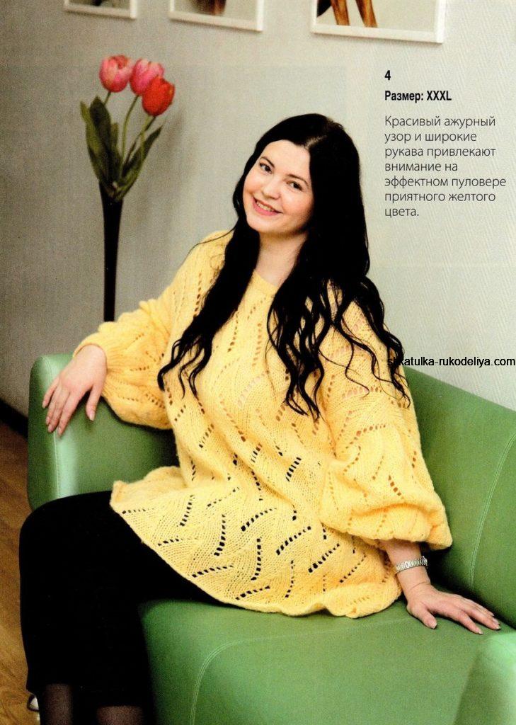 Желтый пуловер с широкими рукавами. Просторный пуловер ажурным узором для женщин