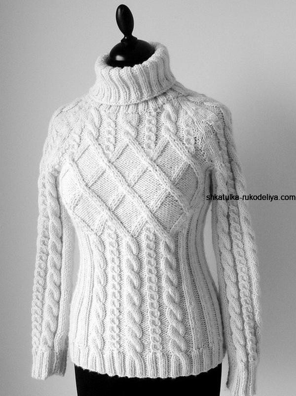 вязание спицами, пуловер, схема, описание, женский, воротник гольф, узор коса, ромб, теплый