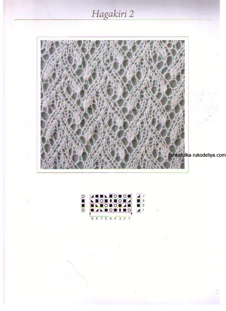 Наберите 13 п. Провяжите их изн., последнюю п. провяжите с первой п. из бокового ряда (набранного по краю основной части), как 2 вм. изн. Теперь приступайте к схеме отделки и повторяйте ее, пока не обработаете все боковые петли шали.