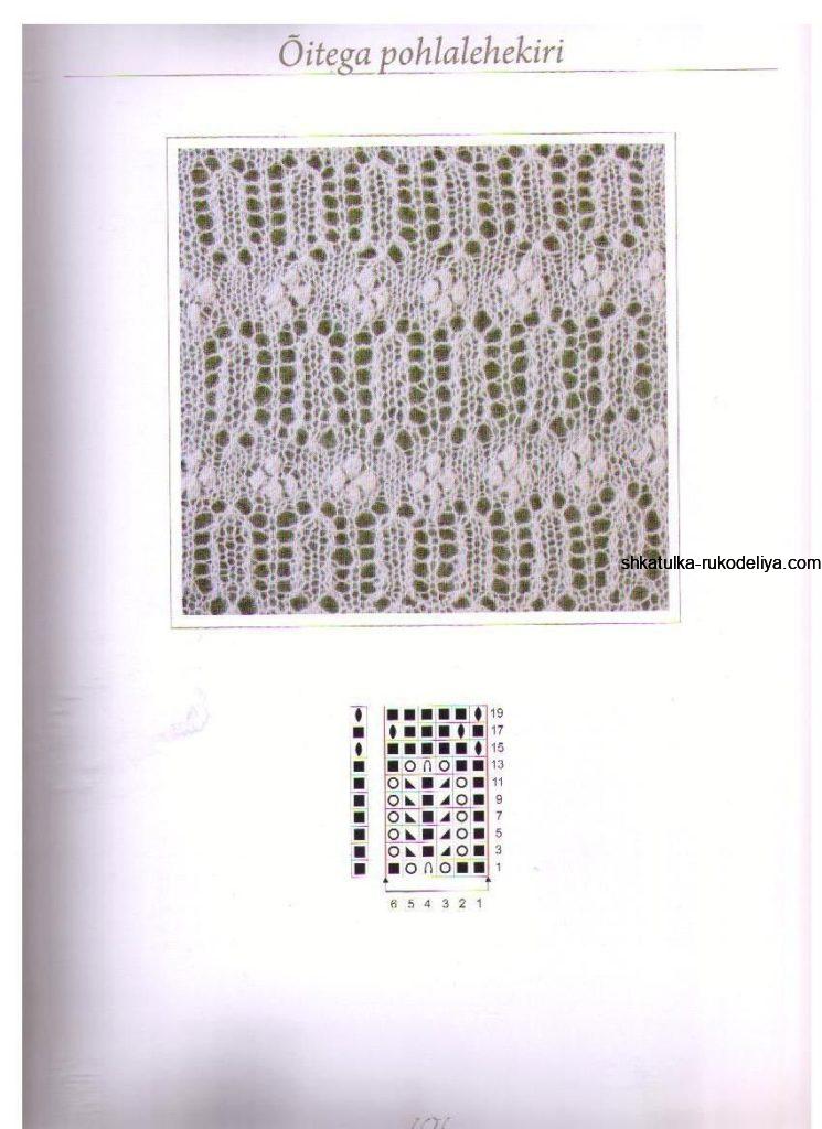 7 р.: снять 1 п., 3 лиц., (2 лиц., накид, снять 1 п., 2 вм. лиц., накинуть снятую п. на провязанную, накид, 2 лиц.)х 10 раз, 2 лиц., накид, убавка с наклоном влево, 3 лиц.