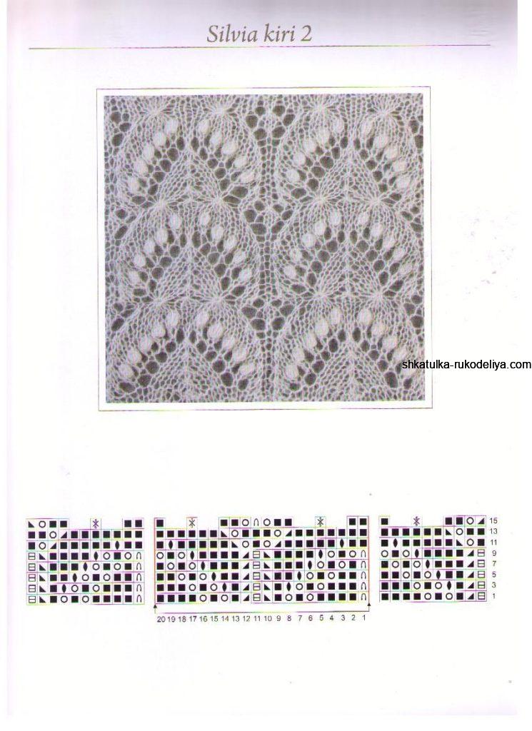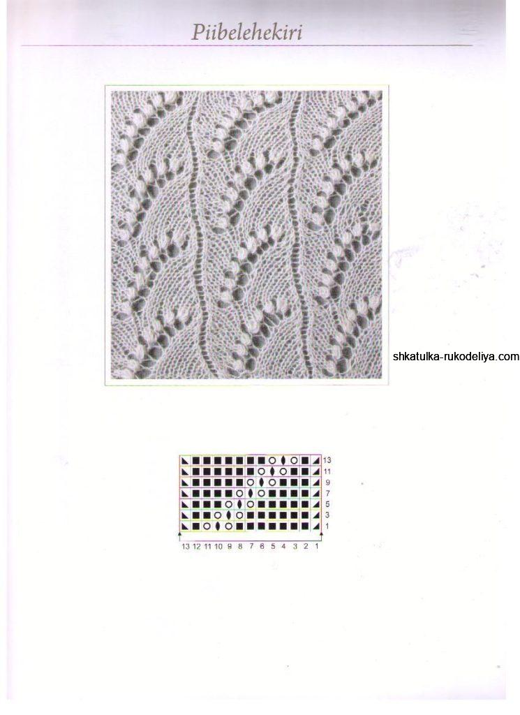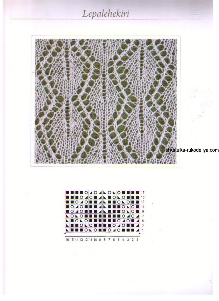 15 р.: снять 1 п., 2 лиц., 2 вм. лиц., накид, 1 лиц., (3 лиц., накид, снять 1 п., 2 вм. лиц., накинуть снятую п. на провязанную, накид, 1 лиц.)х 10 раз, 5 лиц.