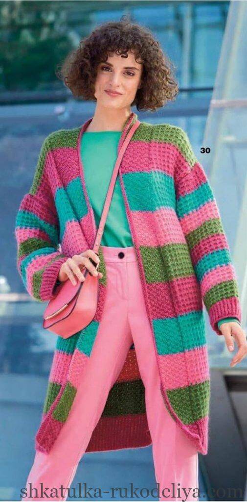 в'язання спицями, жакет, довгий, жіночий, в смужку, незвичайний, простий, схема, опис
