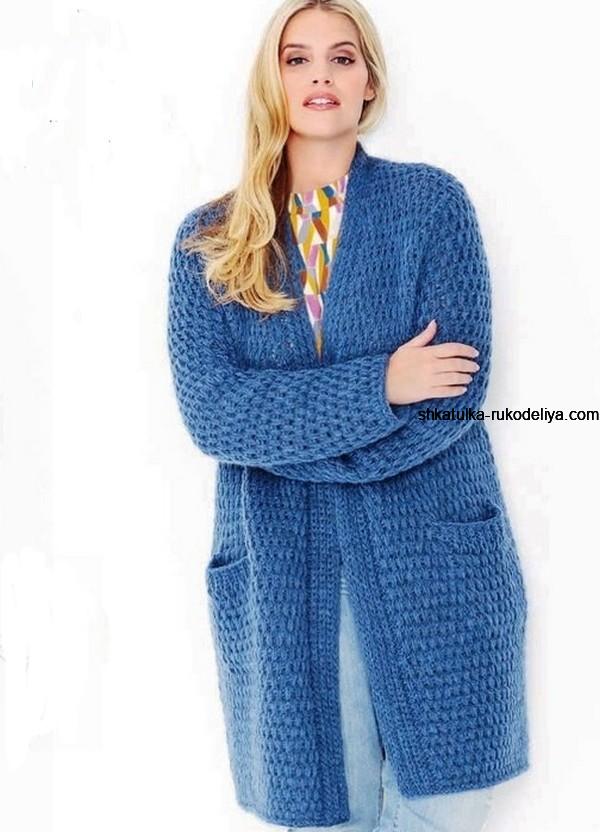 Кардиган с узором из снятых петель спицами. Длинный кардиган с карманами для женщин