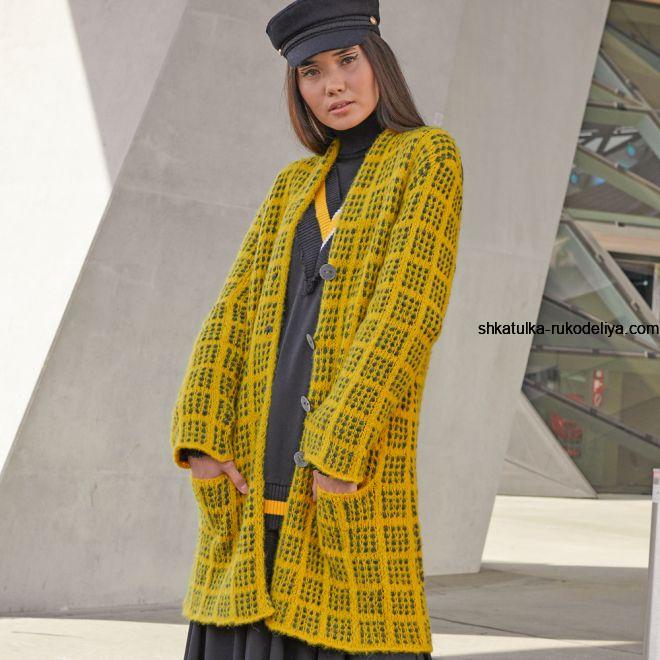 Кардиган в клетку спицами. Стильный двухцветный теплый кардиган с выкройкой и описанием