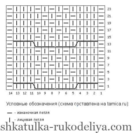 Кардиган, про який ми говоримо, в’яжеться вільного крою. На свободу облягання потрібно щонайменше 20, а бажано навіть 30 сантиметрів — це дуже вільна модель. Рукави в’яжуться лицьовою гладдю, вони спущені, і по них проходить коса, схема якої нижче. Раппорт цього візерунка складає 14 петель та 12 рядів. Усі парні ряди в’яжуться на малюнку.