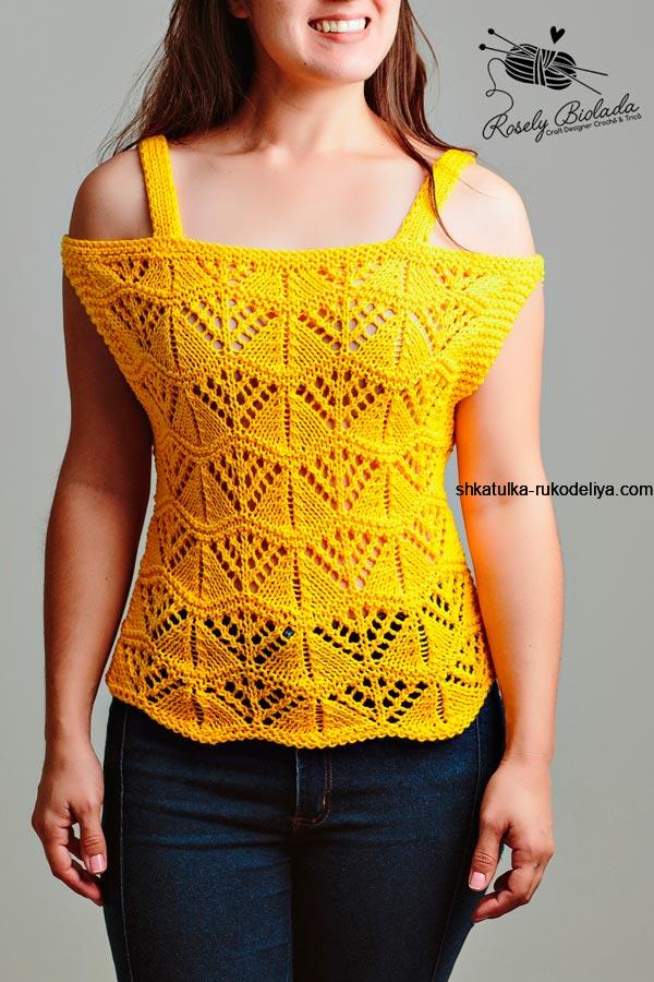 вязание спицами, топ, схемы, узорчатый узор, открытые плечи, желтый, женский