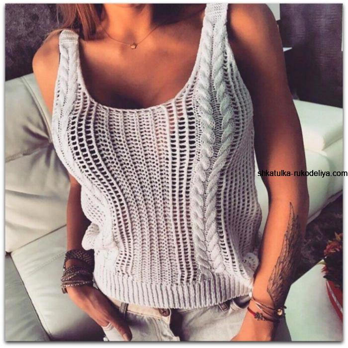 вязание спицами, майка, женская, схема, для лета, модный, сетчатый узор