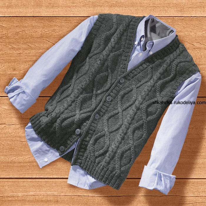 Мужской классический жилет с косами. Мужской жилет спицами на пуговицах из толстой пряжи