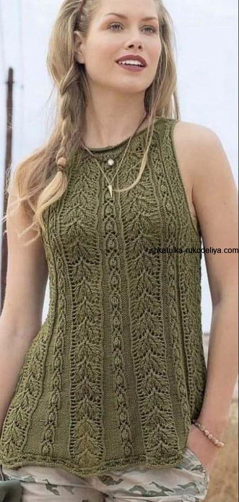 Оливковый летний топ спицами