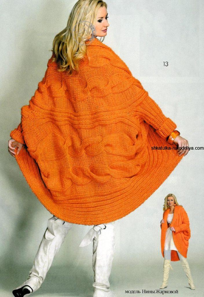 вязание спицами, пальто трансформер, схема, женское, описание, оранжевое, свободной формы