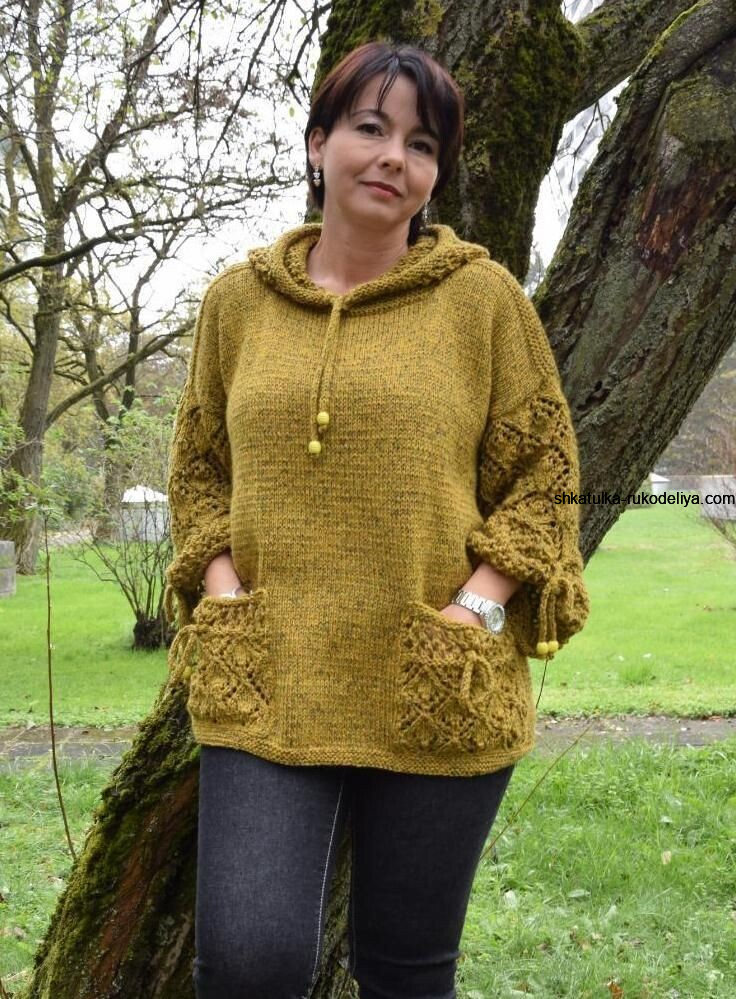 Туника на спицах с капюшоном и карманами. Простая туника спицами для женщин
