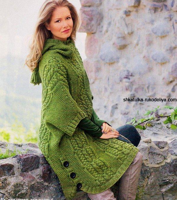 вязание спицами, пончо, капюшон, оливковое, схема, описание, женское, теплое, длинное