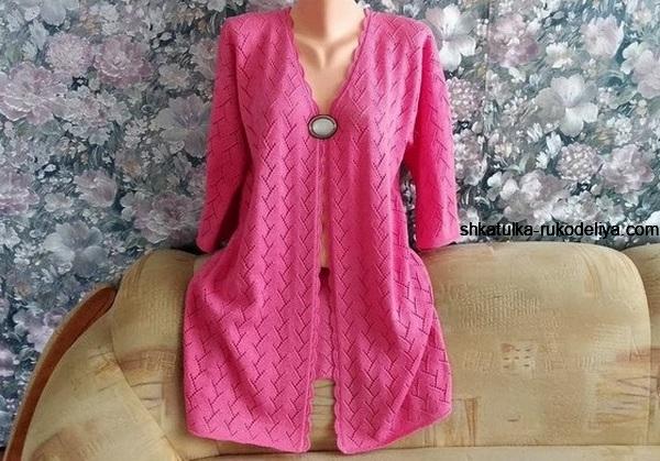 Розовый кардиган узором веточки спицами. Длинный женский кардиган с мастер классом спицами