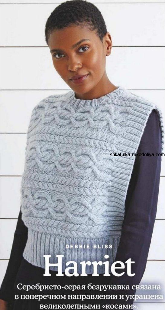 вязание спицами, безрукавка, описание, схема, поперечное вязание, глубокая пройма, косы, женская
