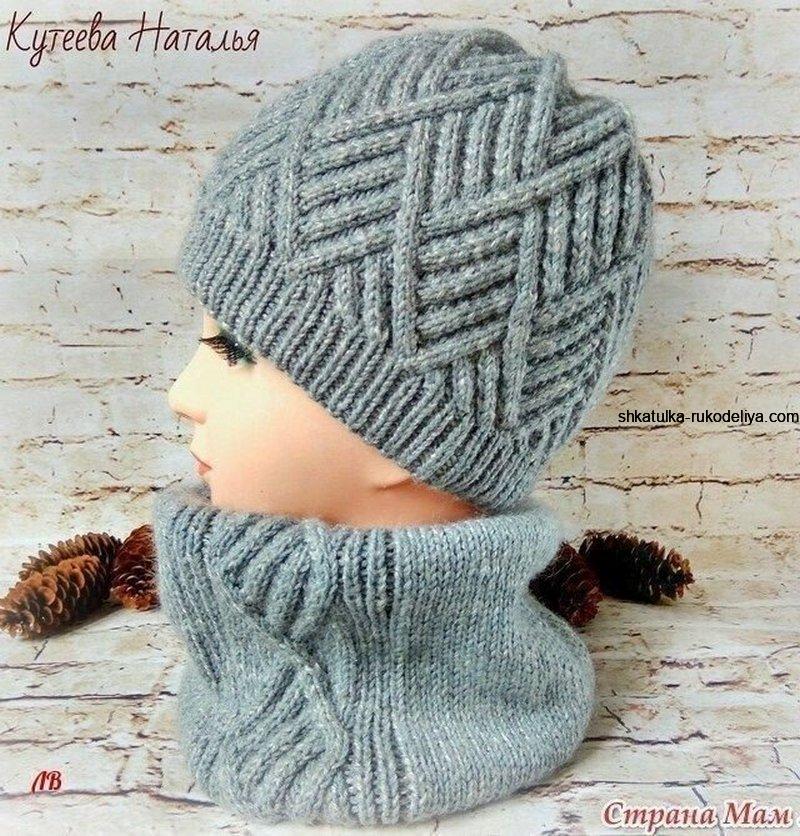 Шапка и снуд Ромбы спицами. Схема и описание комплекта шапка и снуд спицами