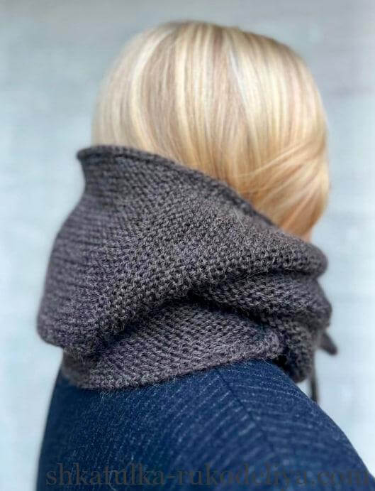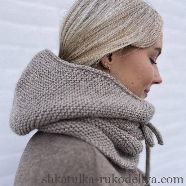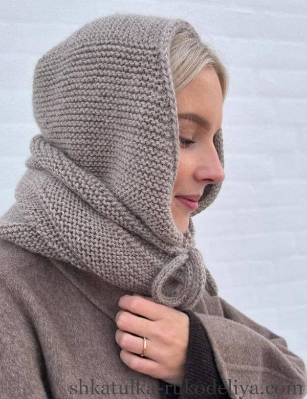 Капюшон в’яжеться зверху вниз. Спочатку в’яжеться верх, а потім петлі набираються по краях. Капюшон в’яжеться туди-сюди. Збільшення вздовж передніх країв поступово змінюють форму капюшона на шарф. I-подібні шнури завершують кожен край і утворюють зав’язки на кожному кінці.