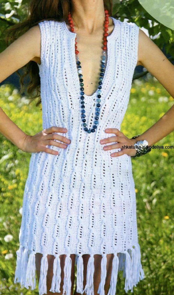 вязание спицами, платье, схема, описание, женское, стиль хиппи, белое, летнее, глубокий вырез