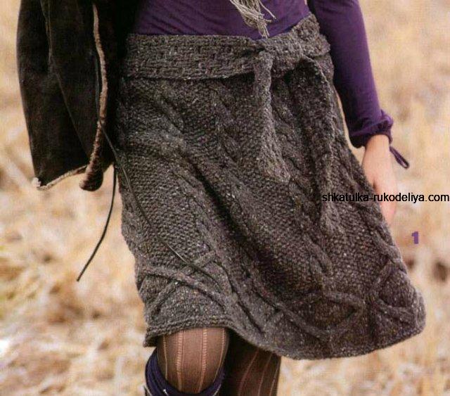 Осеняя юбка рельефным узором спицами. Расклешенная женская юбка спицами