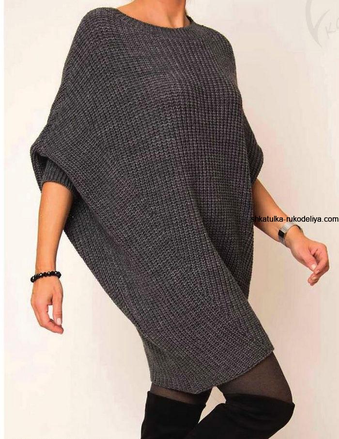 Платье спицами в стиле оверсайз. Туника с рукавом летучая мышь спицами
