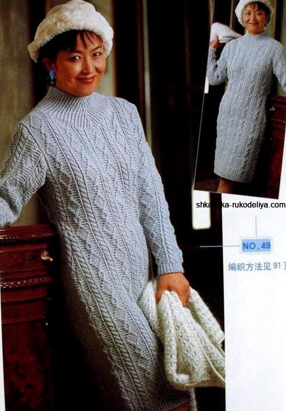 Серое платье спицами. Теплое платье с аранами от японских мастериц