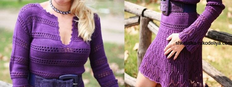 вязание спицами, вязание крючком, платье, женское, весеннее, фиолетовое, реглан сверху
