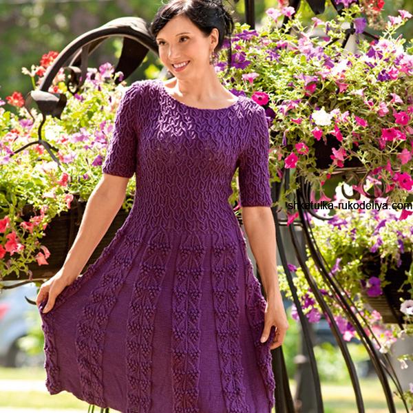 вязание спицами, платье, женское, схема, описание, теплое, фиолетовое, расклешенный низ, короткий рукав