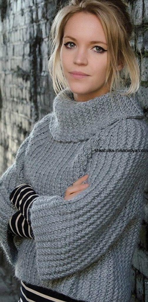 Свитер с широким рукавом спицами. Свитер оверсайз с большим воротником связан резинкой