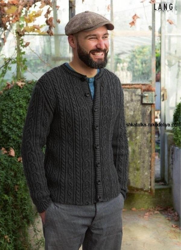 Темно-серый жакет для мужчин спицами. Стильный мужской жакет с косами
