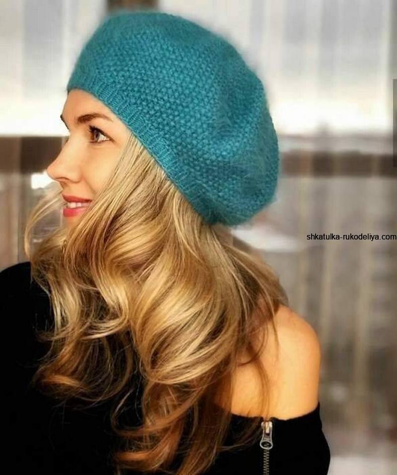 вязание спицами, берет, пух норки, женский, описание, простой, классический, теплый