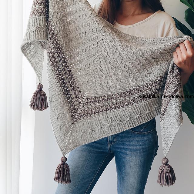 вязание спицами, шаль, двухцветная, треугольная, схема, женская. с кисточками